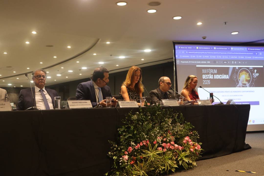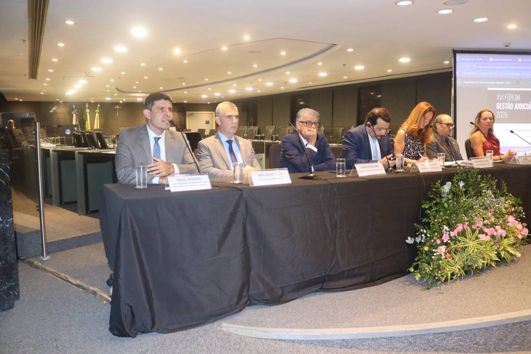 O XVI Fórum de Gestão Judiciária começou nesta quarta-feira (14), no Plenário Délio Maranhão, na sede do Tribunal, no Centro. Promovido pela Escola Judicial do TRT-1, o evento debate os rumos da Justiça do Trabalho e caminhos para decisões com enfoque social, inclusivo e antidiscriminatório. O encontro, que se estende até sexta-feira (16), teve na mesa de abertura, entre outras autoridades, o presidente do Tribunal, desembargador Roque Lucarelli, a diretora da Ejud1, desembargadora Sayonara Grillo, e o juiz Rafael Pazos, que participou de seu primeiro evento institucional em 2026 como presidente da AMATRA1.
